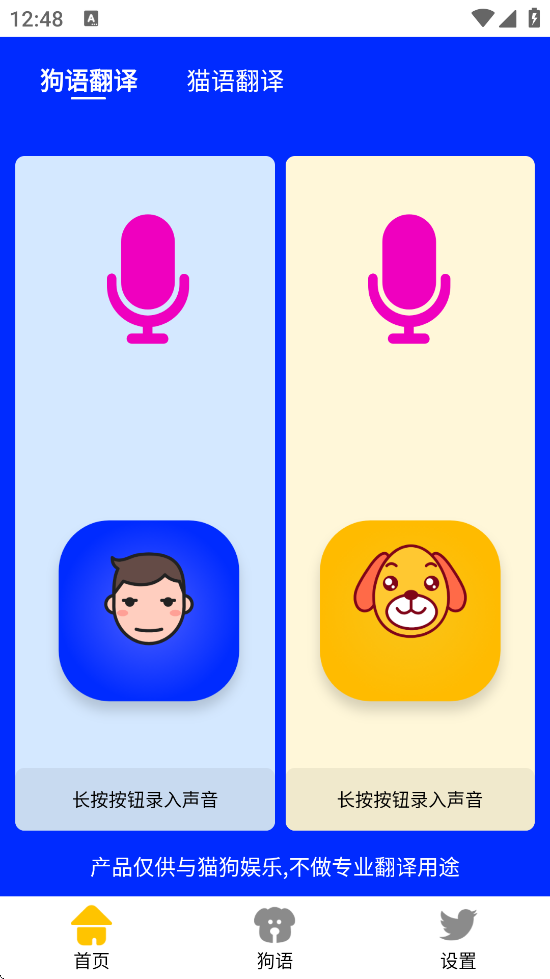 2、将铲屎官的声音转化成狗语和猫语,让人和猫狗交流更轻便,一起来探索不一样的猫狗世界吧!