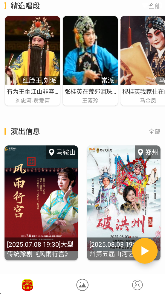 1、同步全国剧院演出信息、戏曲赛事直播(如《梨园春》),整合在线购票及戏迷社群互动功能。